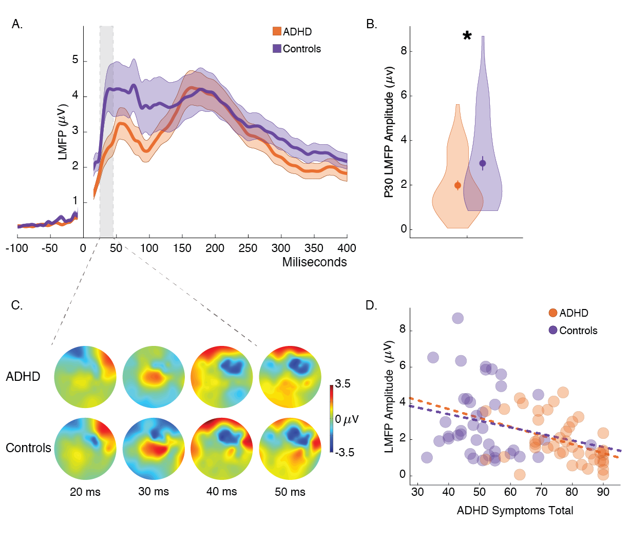 My foundational work examined right prefrontal cortex (rPFC) activity in ADHD. In this study, we compared 57 adults with ADHD to 54 matched controls using TMS-EEG over the rPFC and during a Stop Signal task (Hadas et al., 2021). ADHD participants showed reduced early TMS-evoked potentials (LMFP around P30, 25-45 ms post-TMS), correlating with symptom severity on the Conners’ Adult ADHD Rating Scale (CAARS) (rho = -0.37, p < 0.001).
