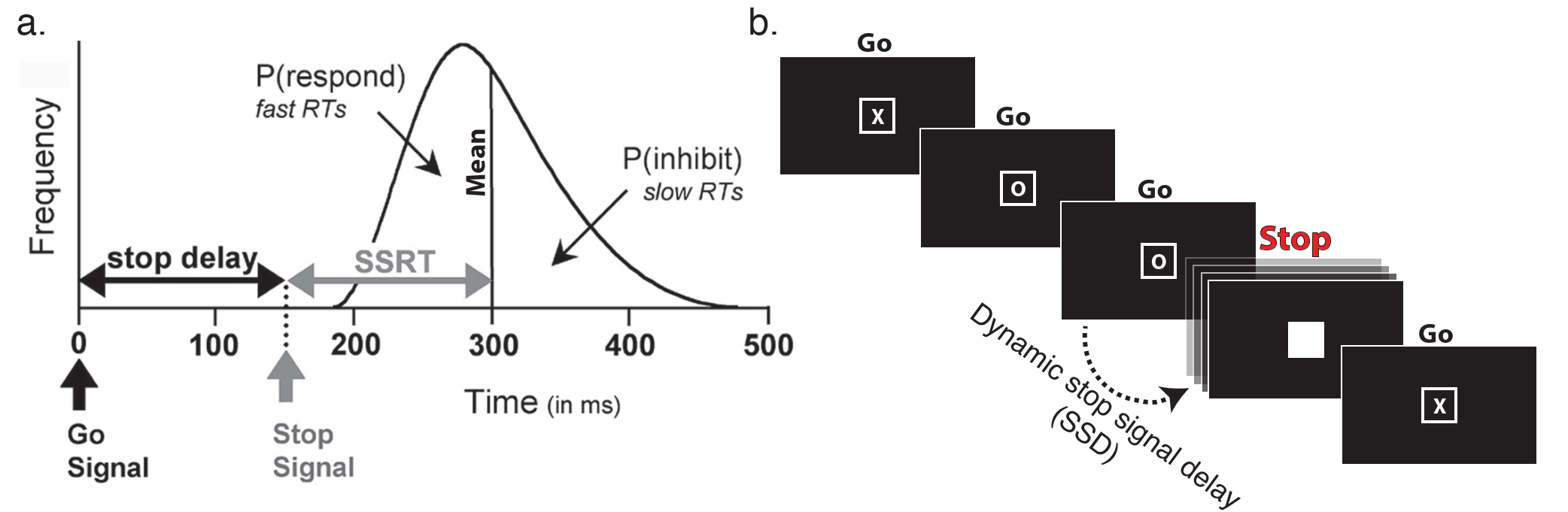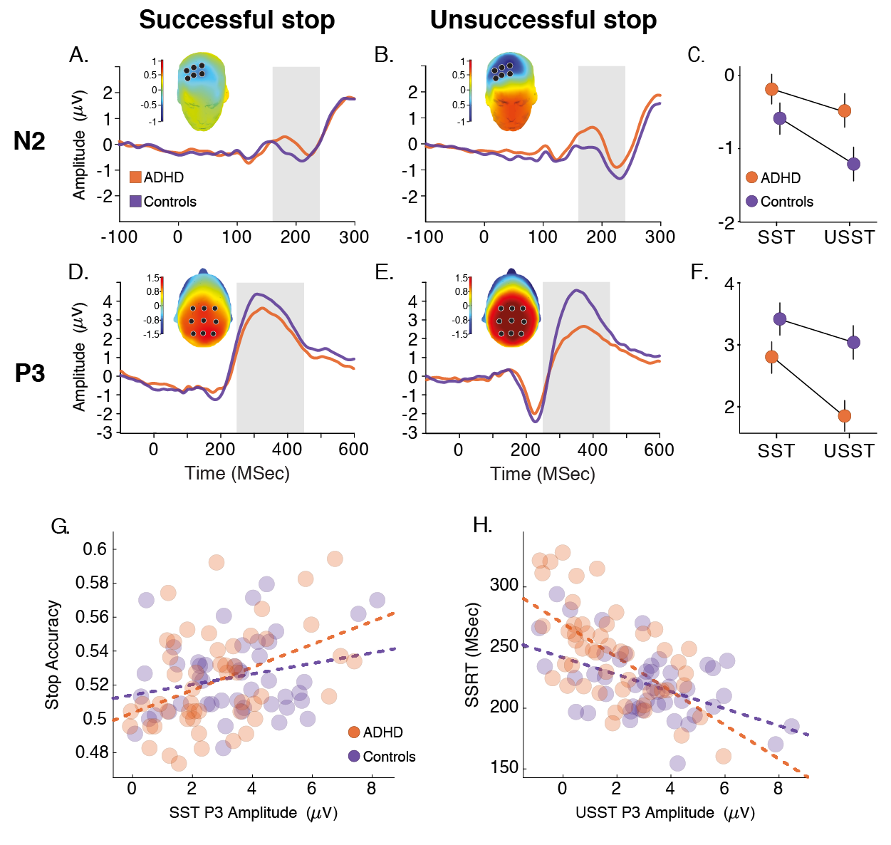 In the task, they had longer Stop Signal Reaction Times (SSRT) and higher errors, with diminished N2 (marginal, p=0.05) and P3 (p=0.012) ERP components—P3 linked to stopping accuracy (rho=0.4, p<0.004) and SSRT (rho=-0.59, p<0.00001).