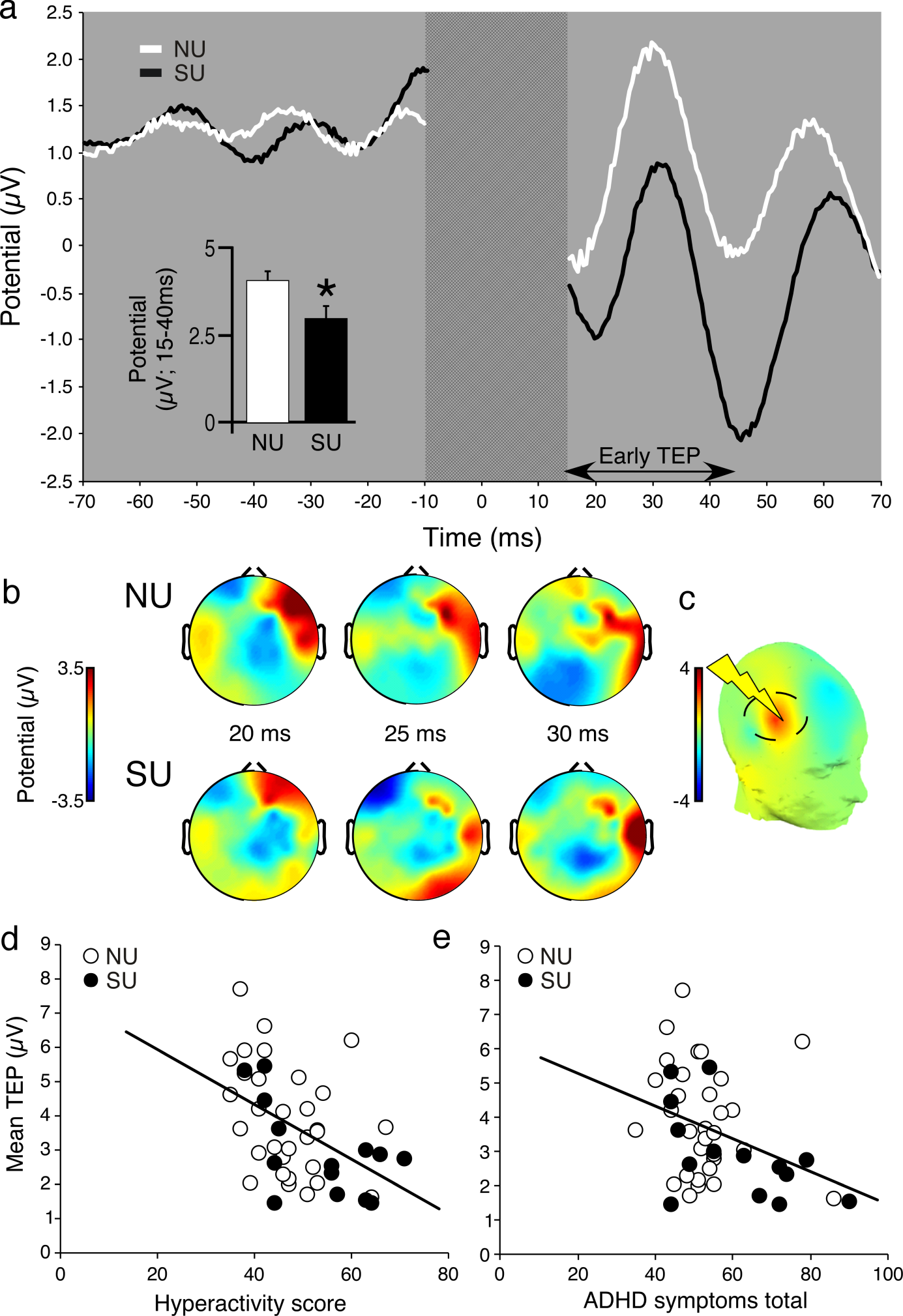 TMS-EEG over the right PFC revealed reduced early TEPs (15-40 ms post-TMS) and lower long-interval cortical inhibition (LICI), correlating with inattention severity (i.e., TEP rho = -0.45, p<0.01; LICI suppression reduced by ~20%).