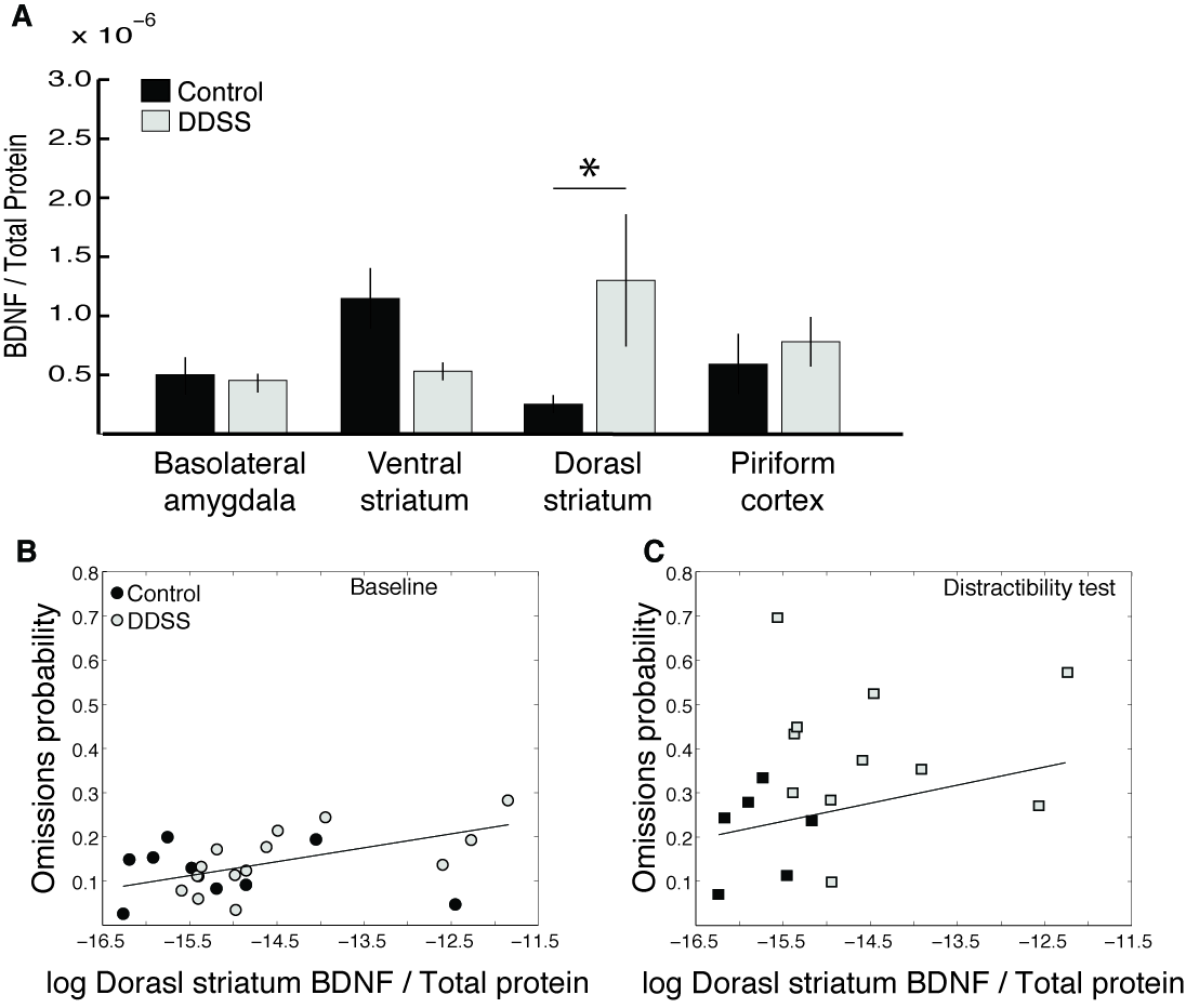 Dorsal striatal BDNF rose, correlating with errors, suggesting plasticity in reward salience.
