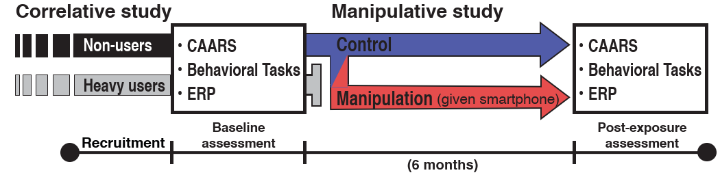 Causally, we exposed 20 non-users (expanded from 12) to smartphones for up to six months (controls n=16). This increased inattention, CAS, and numerical deficits; usage predicted severity. Short-term right PFC changes were absent, implying gradual neural shifts