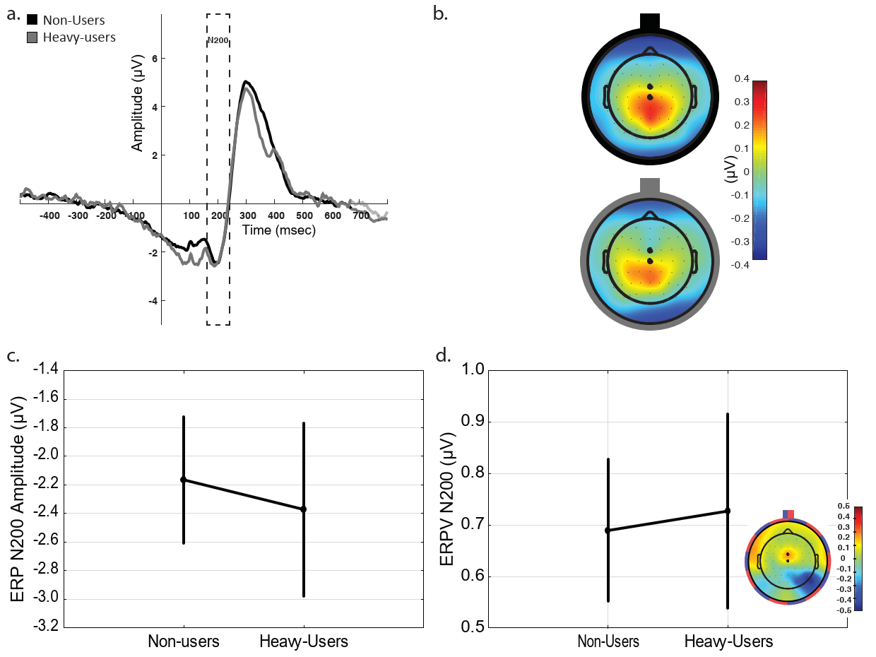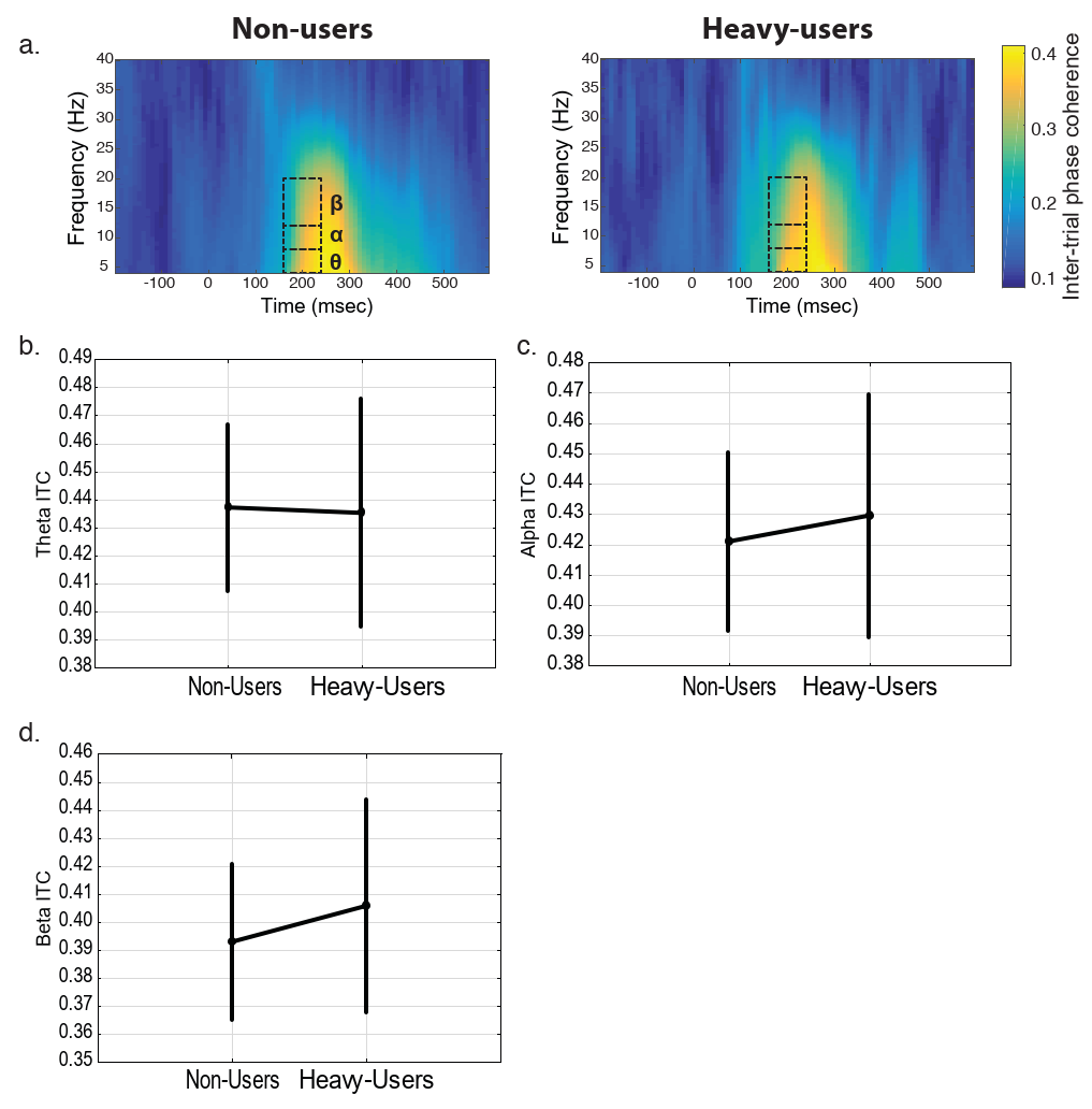 In the Stop Signal task, heavy users showed diminished N200 ERPs (p<0.05), reflecting impaired conflict monitoring, alongside reduced theta-band spectral perturbations and inter-trial coherence—EEG markers of attentional lapses tied to right PFC hypoexcitability.
